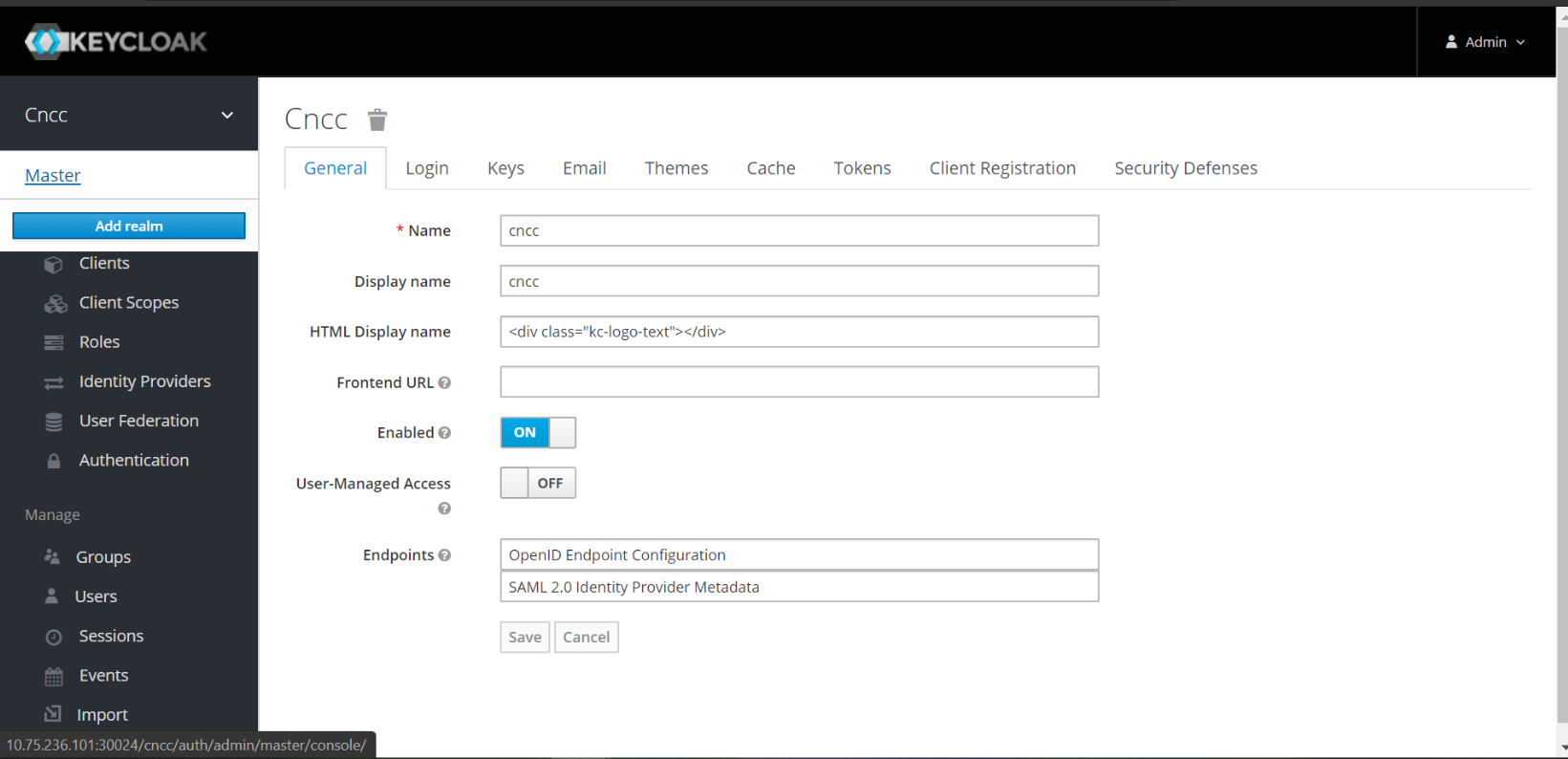 7. Enter CNCConsole URI in the Valid Redirect URIs field (e.g. http://10.75.236.101:30075/*) and click on Save.
