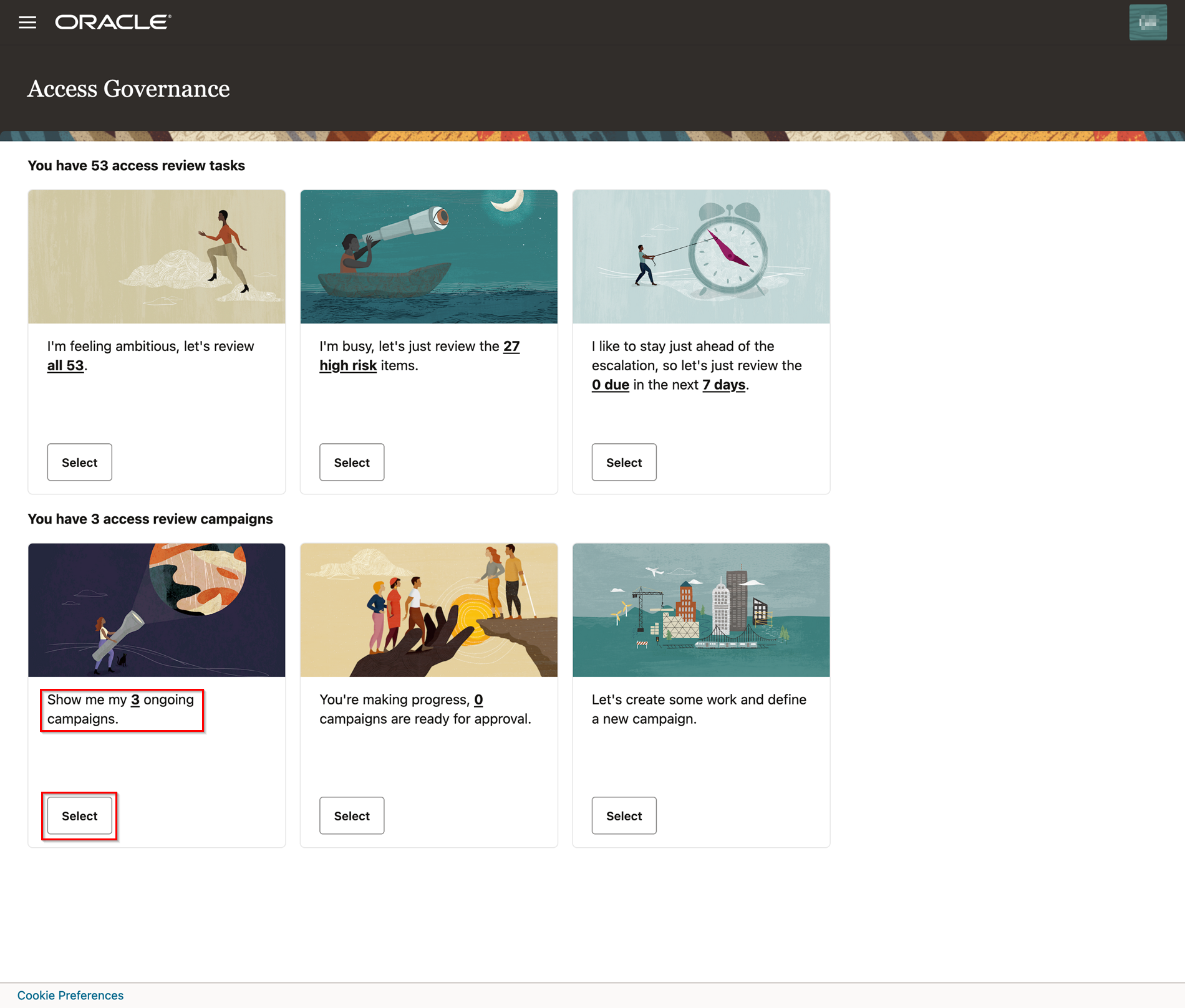 Scrollen Sie auf der Homepage der Oracle Access Governance-Konsole nach unten, und wählen Sie die Kachel Meine laufenden Kampagnen anzeigen aus. Alternativ können Sie Navigationsmenü -> Auf Reviewadministration zugreifen -> Kampagne wählen.