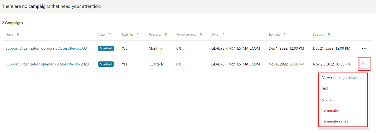 Wählen Sie einen beliebigen Kampagnennamen aus der Liste aus. Hier erhalten Sie zusammengefasste Informationen zu den laufenden Kampagnen, wie Name, Status, Häufigkeit, Verantwortlichendetails, Start- und Enddatum. Wählen Sie für dieses Tutorial Kampagne zur Prüfung des Organisationszugriffs aus.