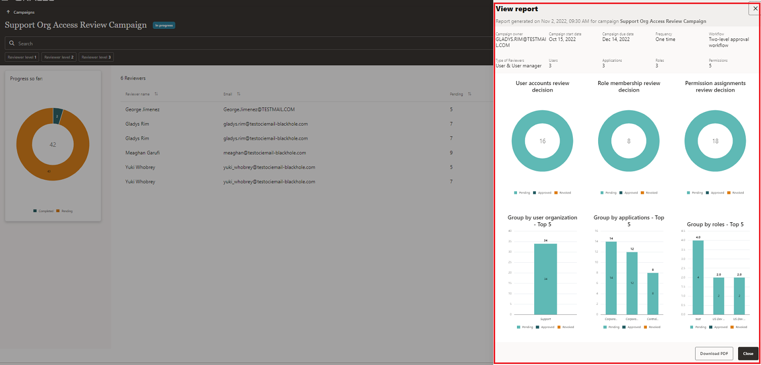 Hier können Sie Out-of-the-box-Analysen mit der Anzahl der Balkendiagramme prüfen, wie z.B. Entscheidung zur Prüfung von Benutzerkonten, Entscheidung zur Prüfung von Berechtigungszuweisungen, Top 5-Benutzerorganisation, Anwendung und Rollen. Sie können eine Kopie des Berichts auch beibehalten, indem Sie den Bericht als PDF-Datei herunterladen.