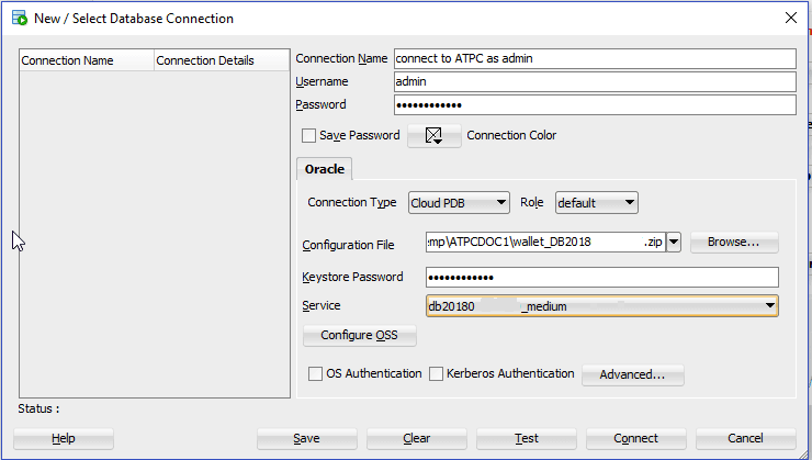 Wählen Sie die Verbindungstyp Cloud-PDB aus.