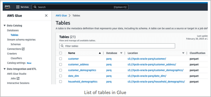 all_glue_tableskönnen Sie eine Liste der Tabellen abrufen, die für die Synchronisierung verfügbar sind.select * from all_glue_tables order by database_name, name;