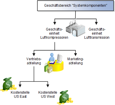 Die folgende Abbildung zeigt eine Managementhierarchie, in der der Geschäftsbereich "Systemkomponenten" seine Aufwendungen in den zwei Kostenstellen "Luftkompressoren" und "Lufttransmission" verfolgt. Auf Abteilungsebene werden zwei Organisationen mit der Klassifizierung "Abteilung" definiert: die Marketingabteilung und die Vertriebsabteilung. Diese beiden Abteilungen können auch als Ressourcenorganisationen angegeben werden, damit Ressourcen wie Vertriebsmitarbeiter und sonstige vertriebsspezifische Informationen zugewiesen werden können. Jede Abteilung wird im Kontenplan durch mehrere Kostenstellen dargestellt. Dies ermöglicht sowohl detailliertes als auch hierarchisches Reporting.