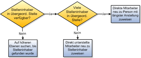 Sind Stelleninhaber in den untergeordneten Stellen vorhanden, werden sie als direkt unterstellte Mitarbeiter des Linienmanagers hinzugefügt. Wenn bereits ein Manager in der untergeordneten Stelle vorhanden ist, wird dieser Wert ignoriert und durch den neuen Manager ersetzt.