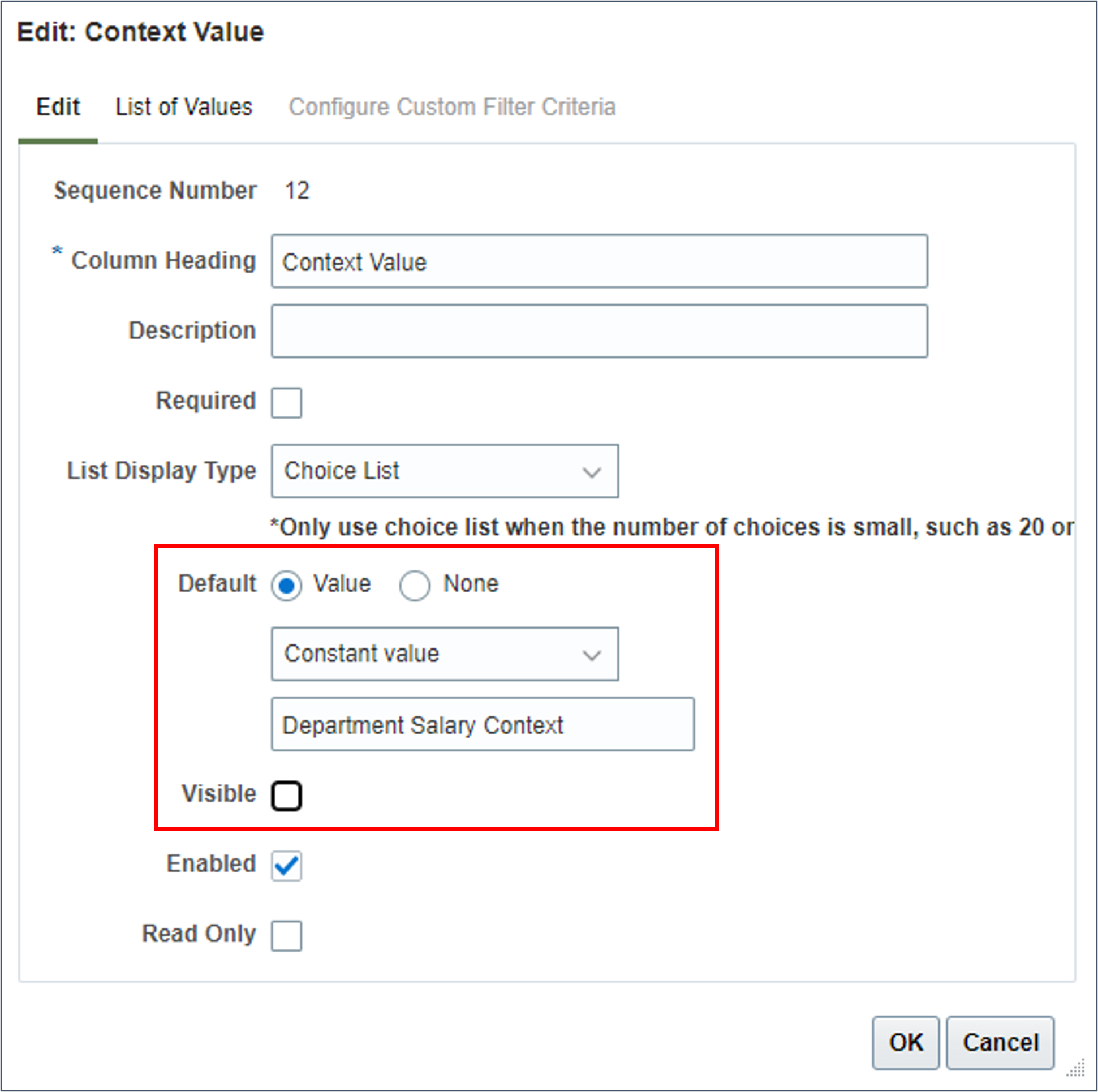 - Bearbeiten Sie den Kontextwert, um einen konstanten Standardwert des Flexfeld-Kontextcodes für die hinzugefügten Info-Flexfeld-Segmente zu definieren. Dieses Attribut kann ausgeblendet werden.