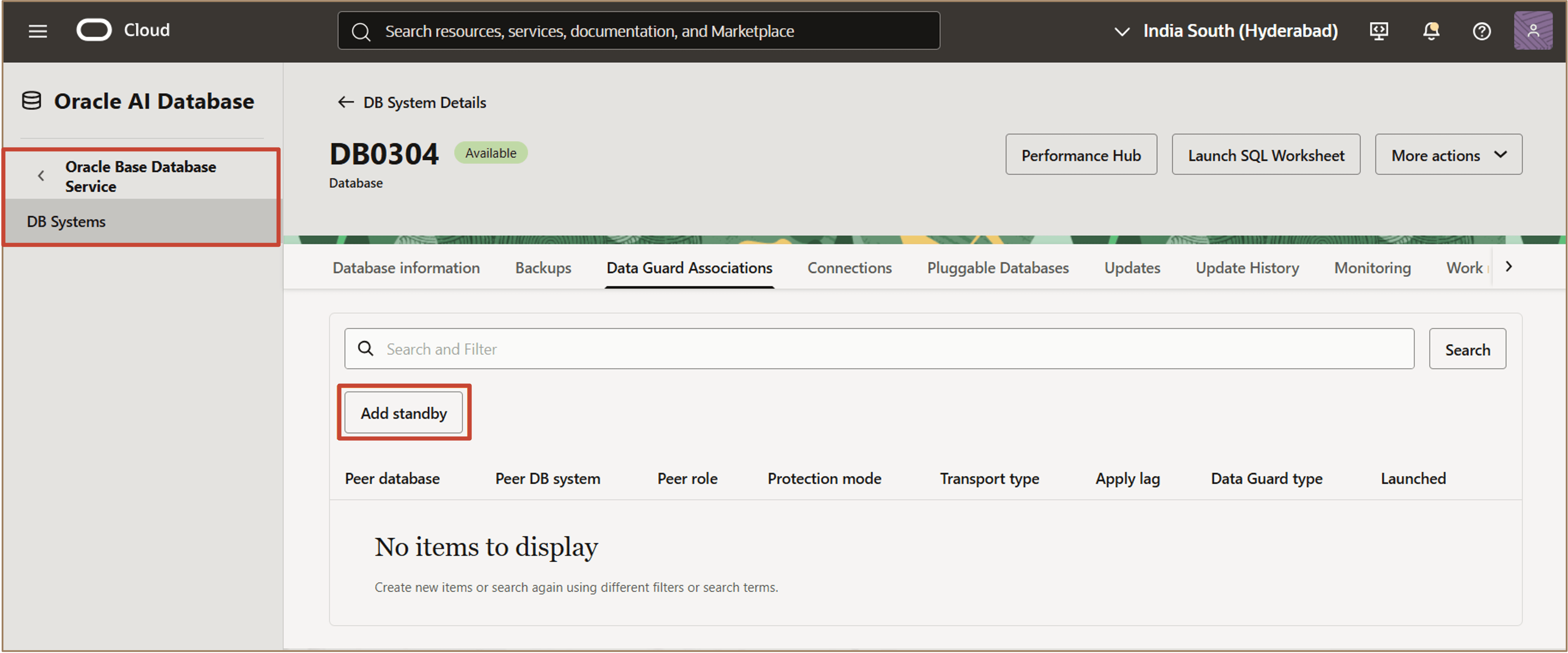 Sie können zusätzliche Standbydatenbanken erstellen, indem Sie auf der Seite "Primärdatenbank" auf Standby hinzufügen klicken und die erforderlichen Details angeben.