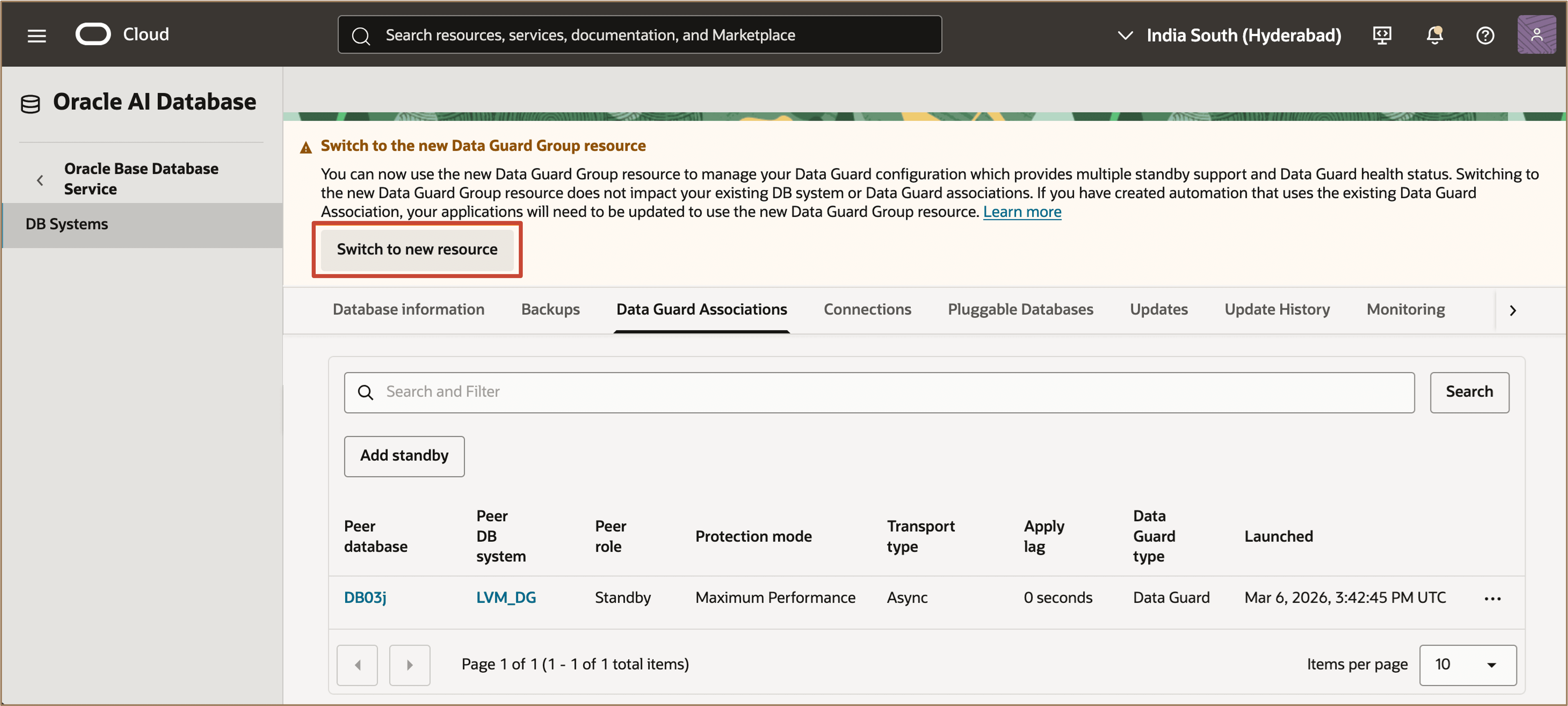 Um mehrere Standbydatenbanken mit Cloud-Automatisierung hinzuzufügen, müssen Sie zur Ressource Data Guard-Gruppe wechseln. Dies kann jederzeit erfolgen.