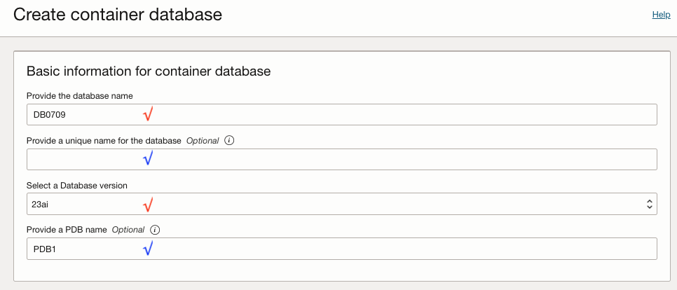 Geben Sie auf der Seite Containerdatenbank erstellen die folgenden Informationen ein.