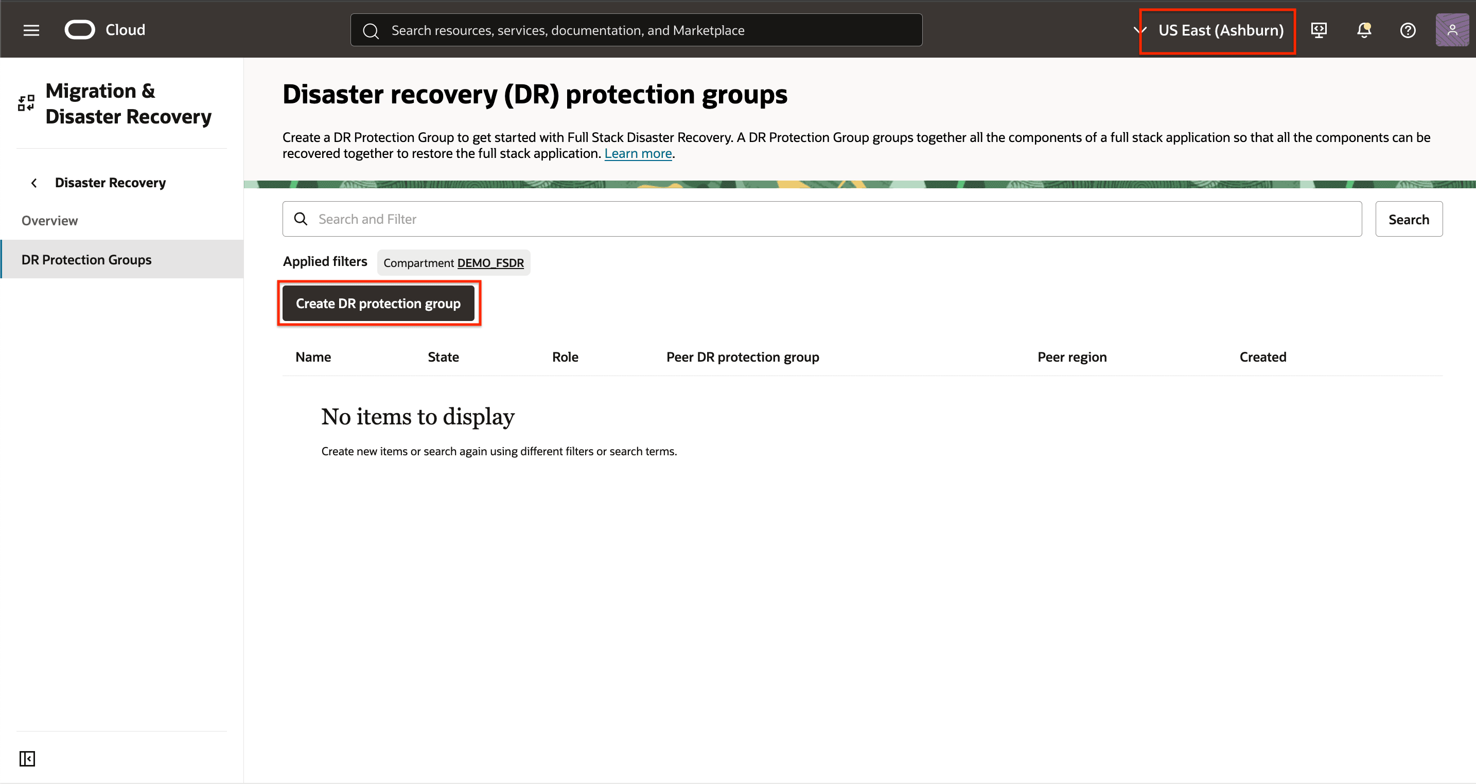 Region 1 ist Ashburn: Ashburn dient zunächst als primäre Region. Diese Rolle wird jedoch während des Switchover-Prozesses in den Standby-Modus versetzt, der in den späteren Aufgaben im Rahmen des Disaster Recovery-Plans ausgeführt wird.