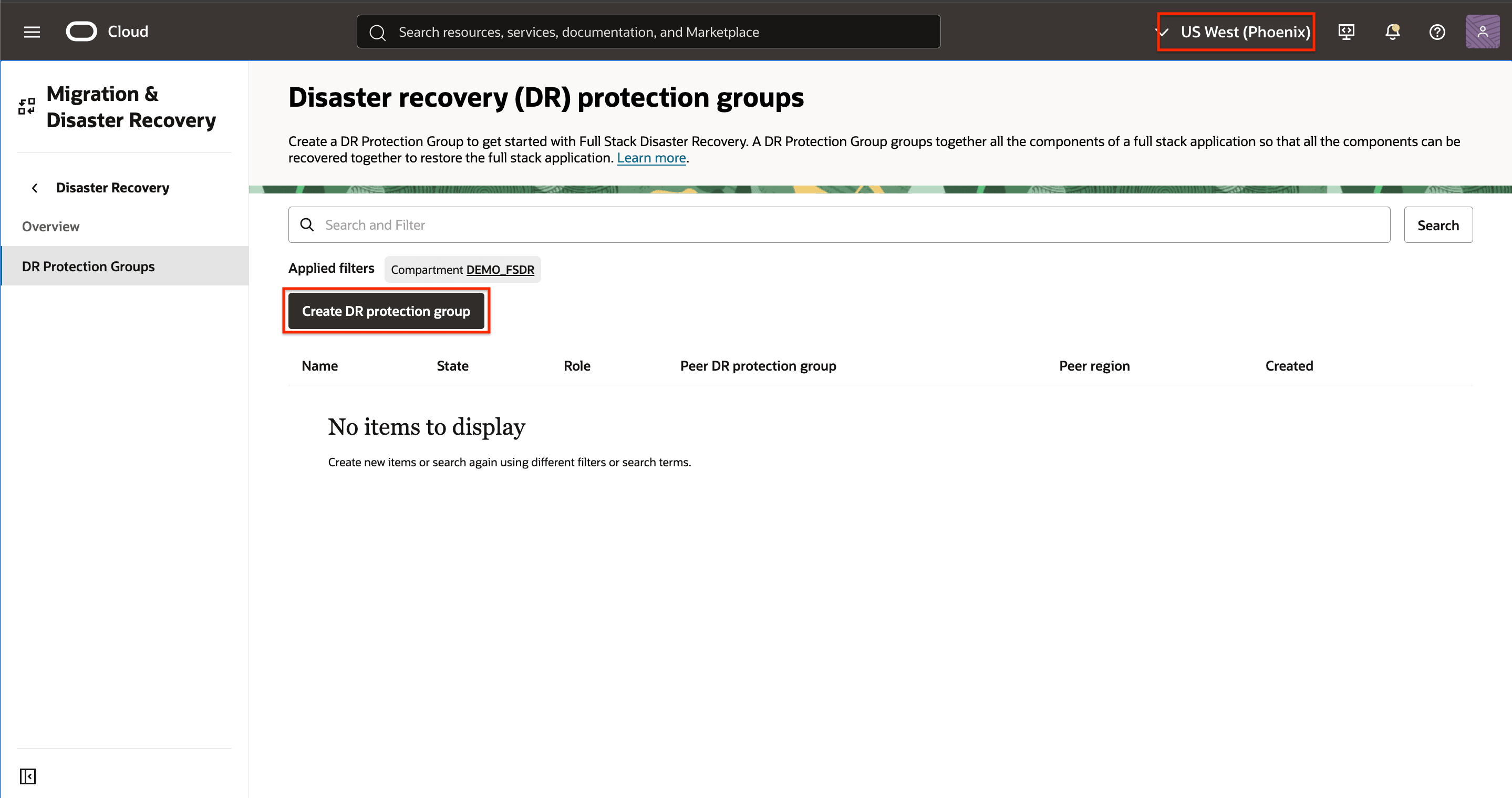 Navigieren Sie zur OCI-Konsole, und navigieren Sie zu DR-Schutzgruppen, wie in Abbildung 1.4 dargestellt.