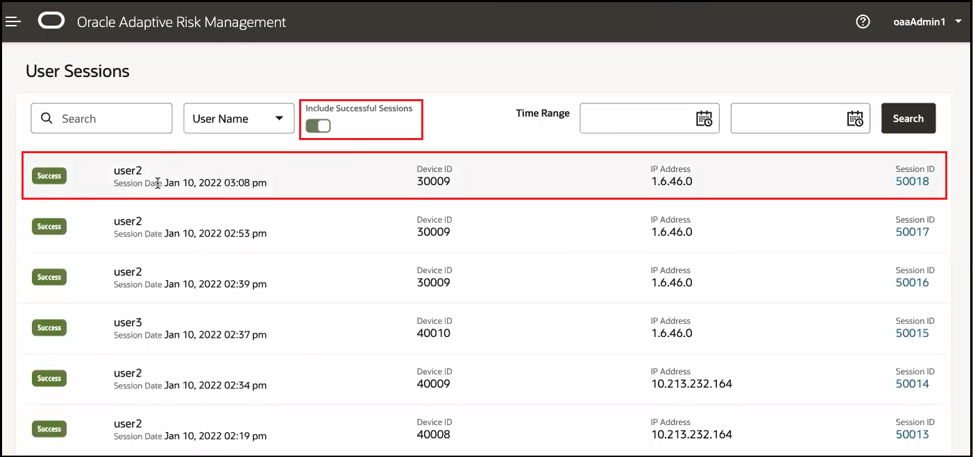 Klicken Sie auf die Umschaltfläche Erfolgreiche Sessions einschließen, um die Liste der erfolgreichen Anmeldungen anzuzeigen. Sie werden user2-Anmeldedaten vom gleichen Gerät, aber von einer anderen IP-Adresse bemerken.