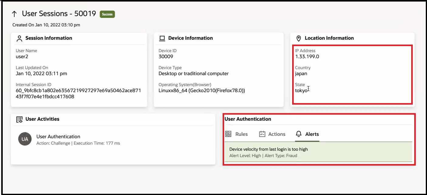 In diesem Tutorial wird ein Szenario behandelt, in dem der Administrator die Out-of-the-box-Regel Herausforderung basierend auf maximaler Geschwindigkeit des Geräts verwendet, um eine solche betrügerische Benutzeraktivität zu erkennen, einen Alert auszulösen und den Benutzer vor einer erfolgreichen Anmeldung aufzufordern. Dies geschieht in Verbindung mit den Geolocation-Daten. Der Administrator kann Alerts, Aktionen, Regeln und andere benutzerbezogene Informationen über das Dashboard Benutzersession überwachen.
