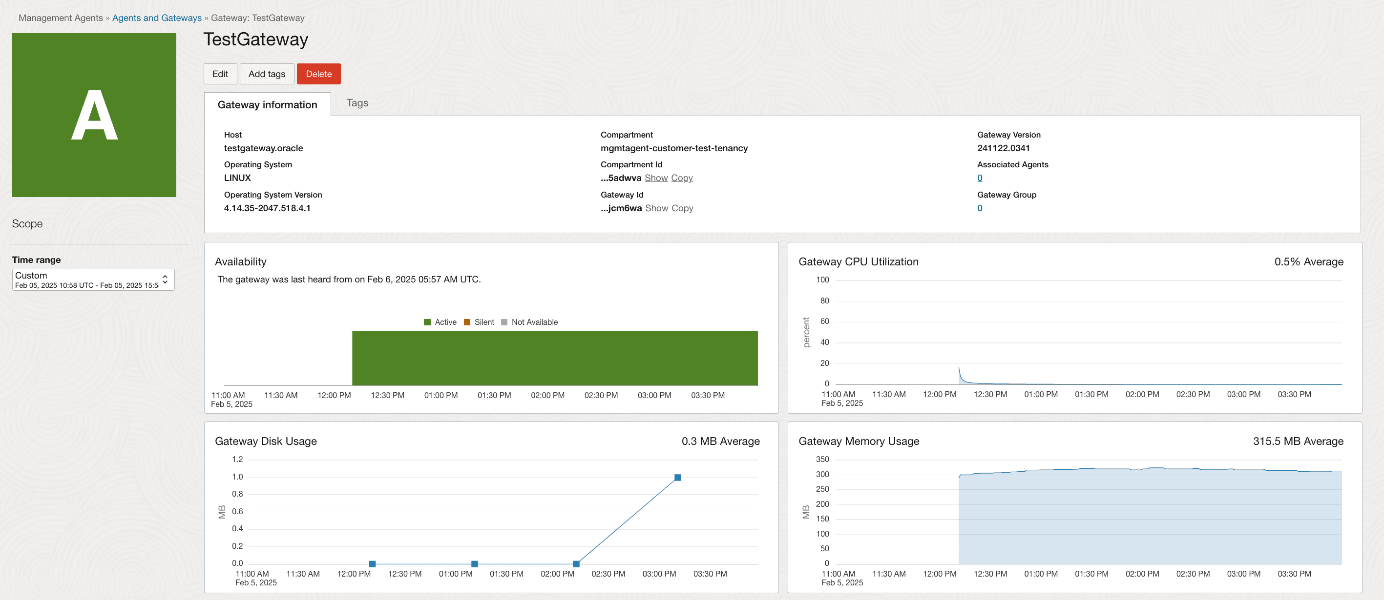 The Gateway Information tab shows detailed gateway information. It displays the host name, compartment name, gateway version, operating system, associated agents and more.