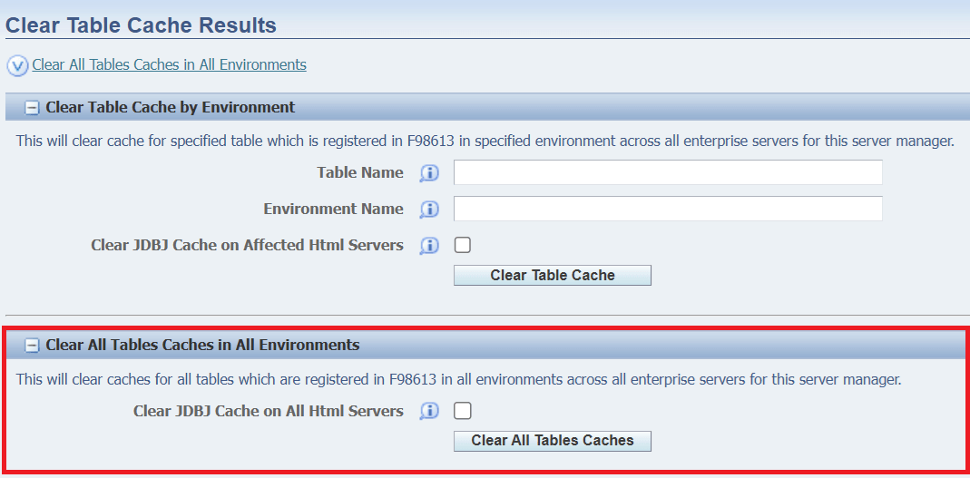 - Tools Release 9.2.9.3 and later: Select Clear JDBJ Cache on All HTML Servers to clear the JDBj cache across all the HTML servers.