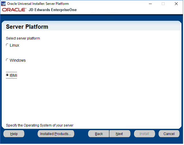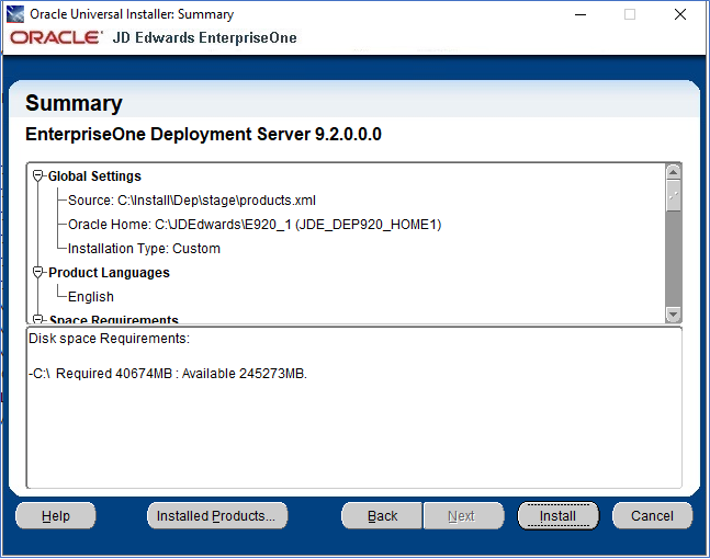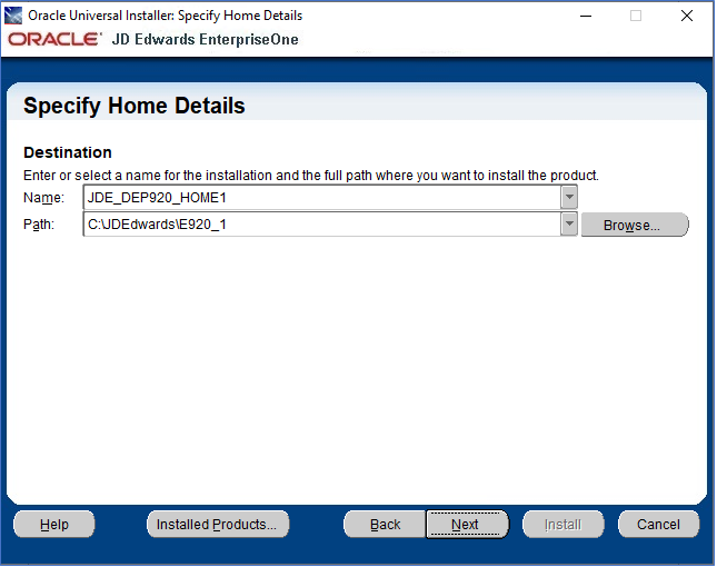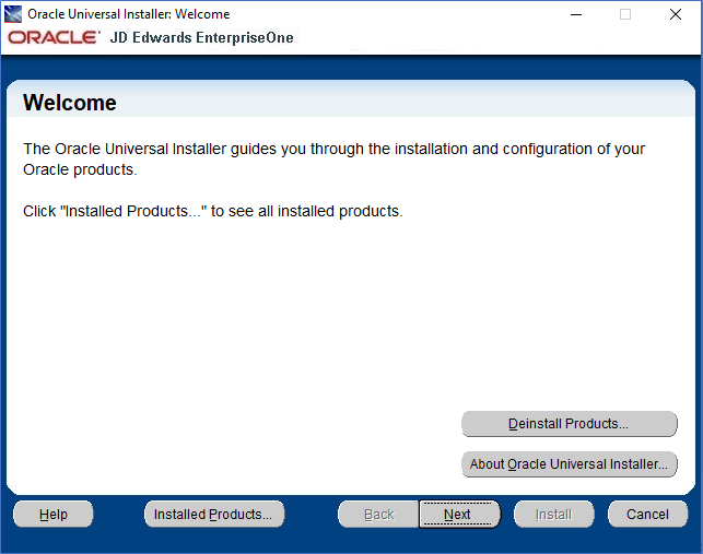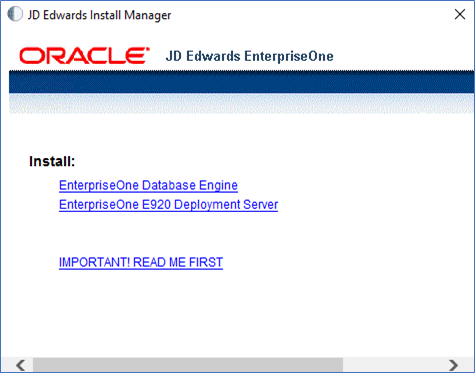 program. - In the Install section, select the link for EnterpriseOne E920 Deployment Server link to launch the Oracle Universal Installer (OUI) for the JD Edwards EnterpriseOne Deployment Server.