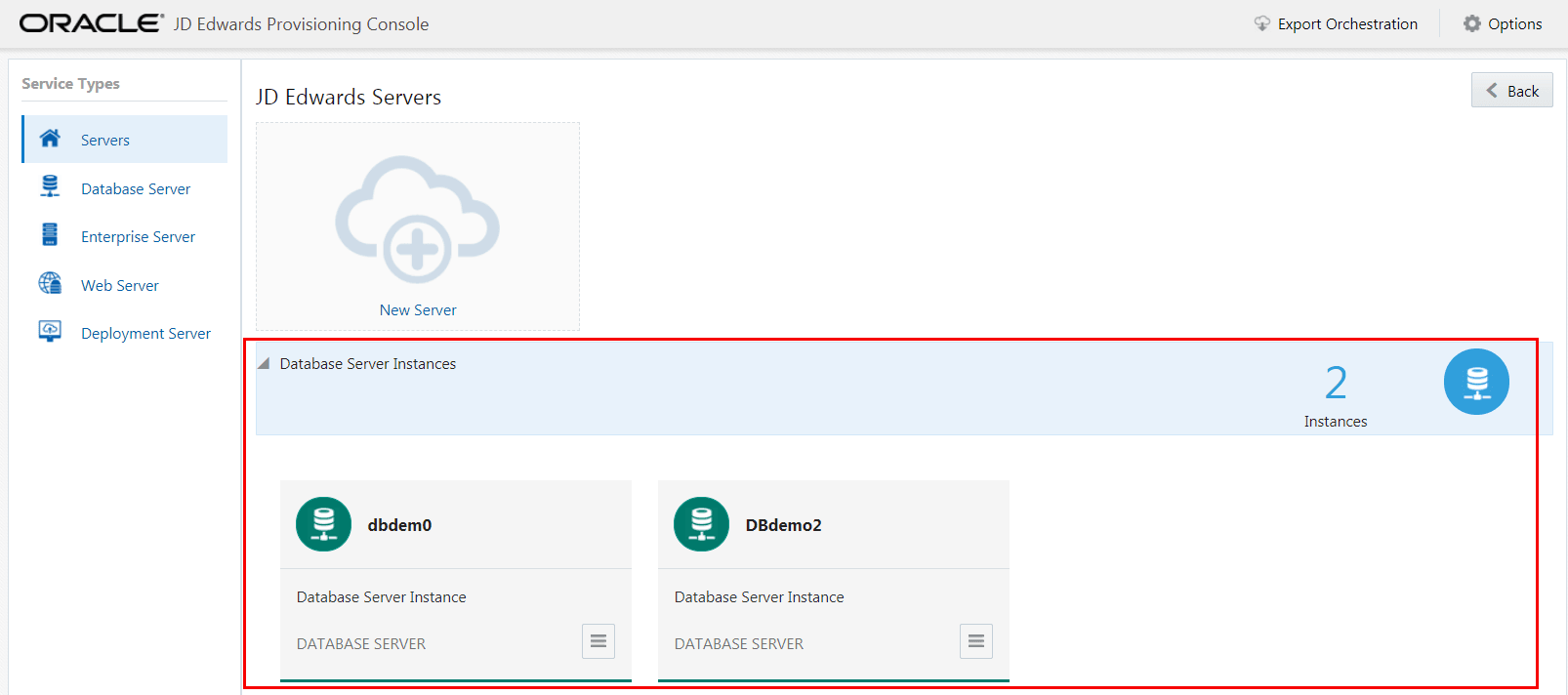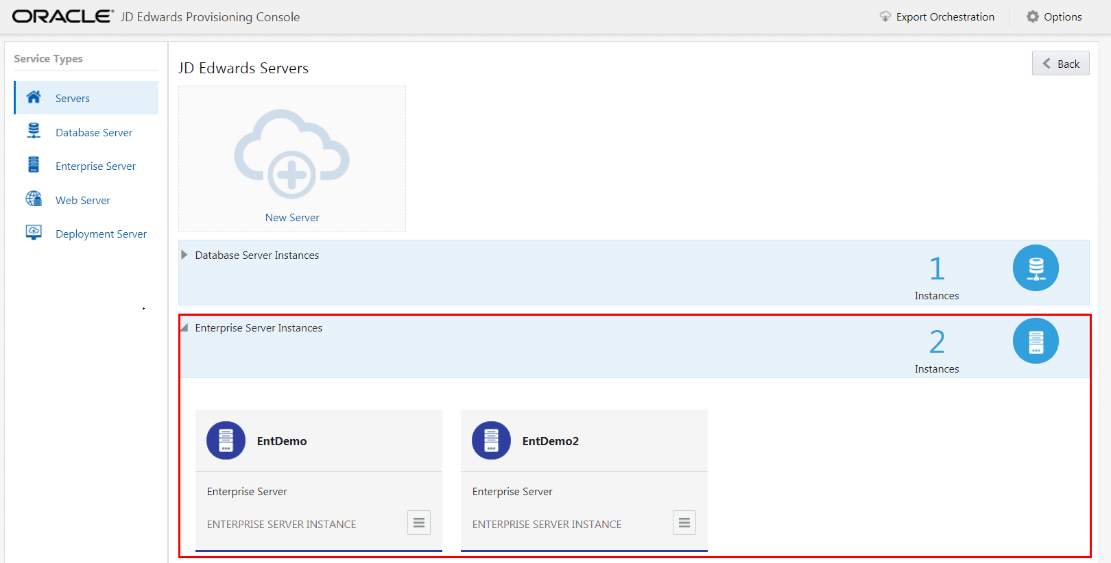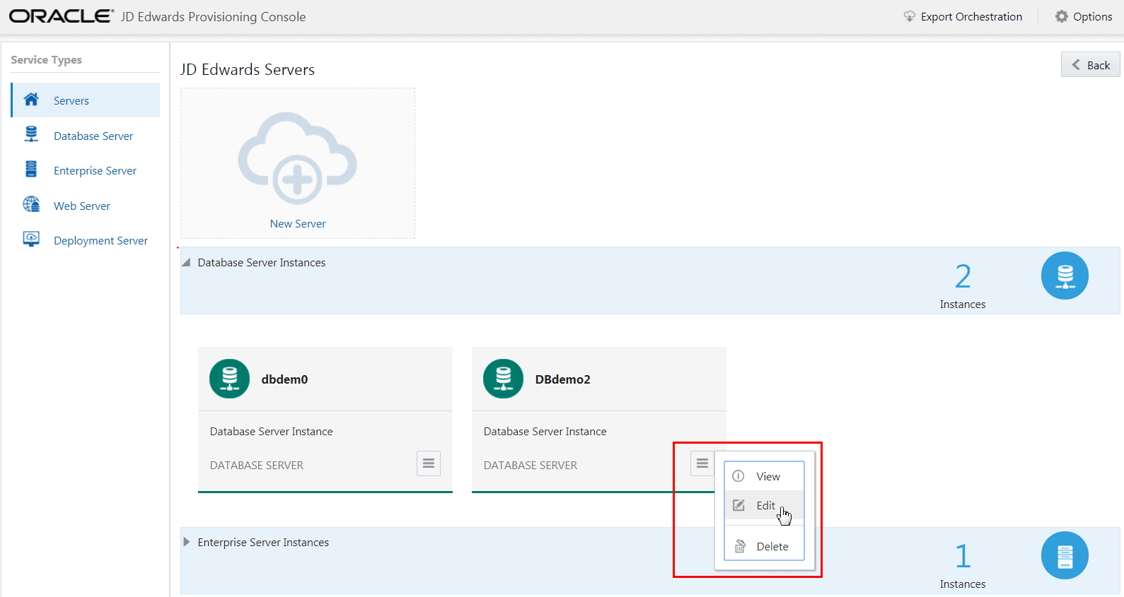 - On JD Edwards Servers, click on the instance of an existing server, or click the