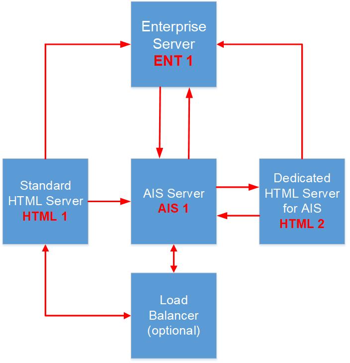 - Configured for two-way communication with both an Enterprise Server (ENT 1) and, for AIS runtime, to the Dedicated HTML Server for AIS (HTML 2)