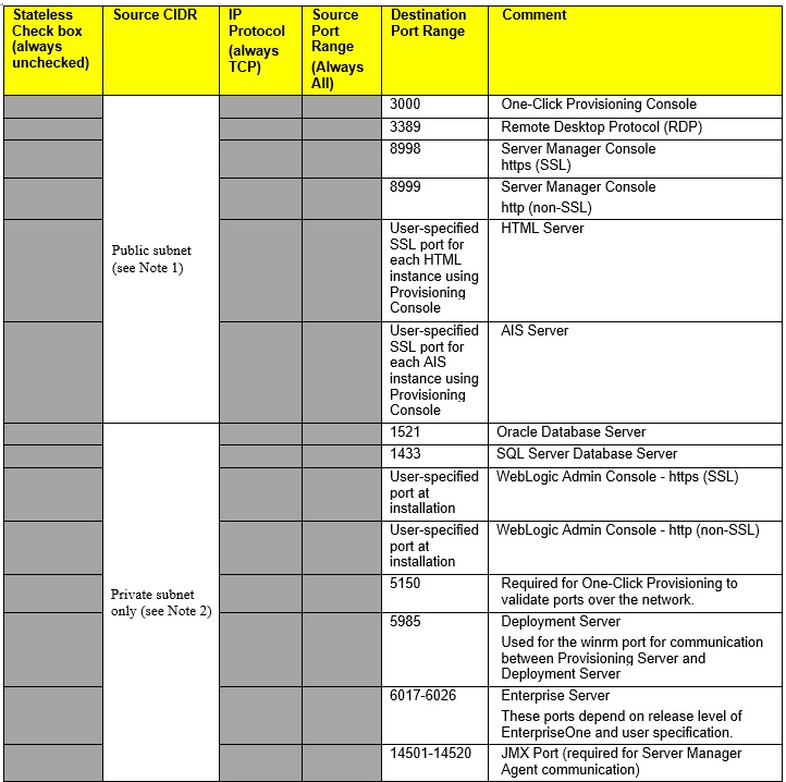 This section shows you how to create rules for virtual cloud network (VCN) security list in Oracle Cloud Infrastructure for use with JD Edwards EnterpriseOne One-Click Provisioning.