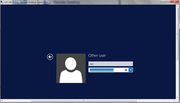 6. On Remote Desktop Connection, enter opc as the user and paste the copied password.