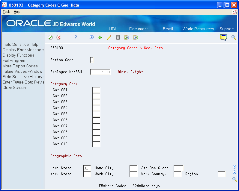 From Additional Employee Data & Reports (G07111), choose Category Codes & Geo. Data
