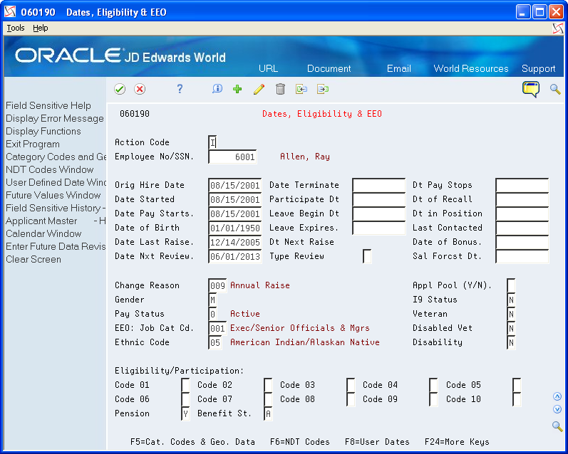 From Additional Employee Data & Reports (G07111), choose Dates, Eligibility & EEO