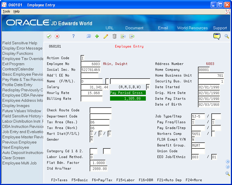 Therefore, in order to ensure that all necessary address information is in both the electronic file and on printed forms, JD Edwards World suggests that you enter the employee's address information using a maximum of 22 characters on each of the first two address lines.