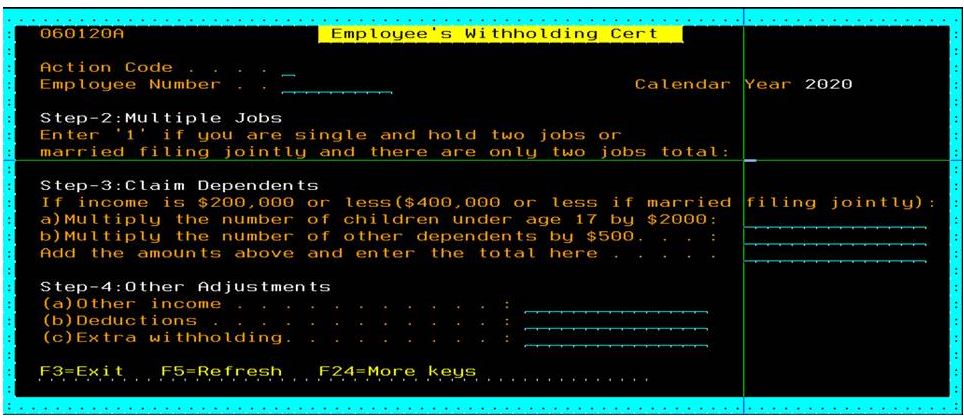 The IRS Form W-4, Employee's Withholding Allowance (060120A) is the program that employees use to enter information needed for the IRS W-4 Form.