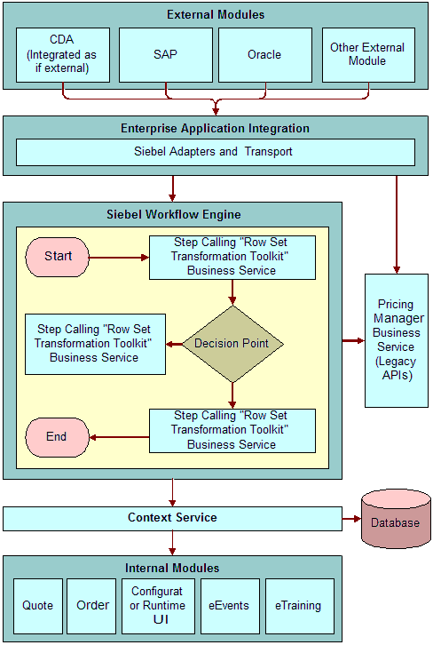 External Modules. This is the point where the integration starts. For example, Oracle eBusiness Suite, SAP or other systems provide product pricing information to Siebel.