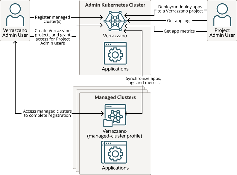 - The admin cluster is a central point from which Verrazzano applications in managed clusters can be deployed and monitored.