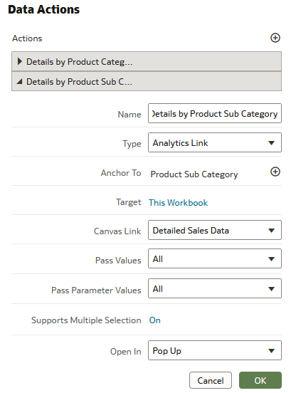 In this section, you create a data action to connect Product Sub Category values to the Detailed Sales Data canvas.