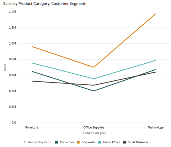 and select Create Parameter. Oracle Analytics updates the line visualization to reflect Sales by Product Category and Customer Segment for 2020.