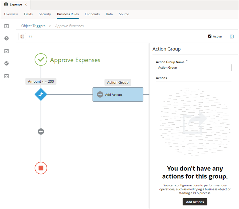 Description of the illustration vbcsbr_cond1_s1.png - In the Action Group pane, enter