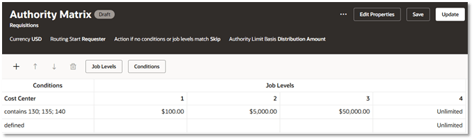 Property Description Routing Start Beginning user type (for example, Requester) and job level of the approver in the matrix. Action if no conditions on job levels match This determines an outcome if no rules are met. You can raise an error, skip the assignment, reject the task, or automatically approve the step. Authority Limit Basis For a requisition, there are two amount fields for distribution. Choose the basis you want to use. Distribution Amount accounts for percentage distributions by different charge accounts. Distribution Approval Amount accounts for taxes, shipping, VAT, and other miscellaneous charges that should be reflected in the approval routing. Authority Limit Calculation This determines how the distribution amount for the approval is calculated, based on all distribution amounts or only those meeting the conditions in an associated step. -