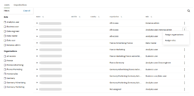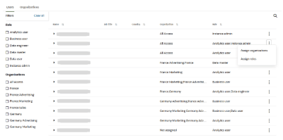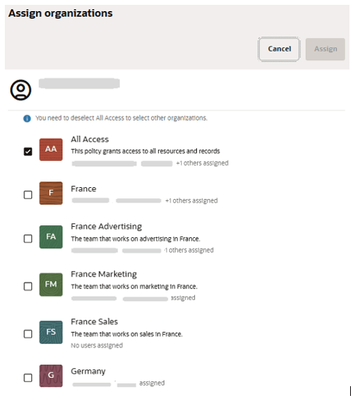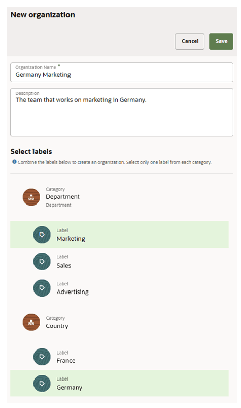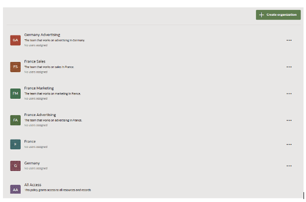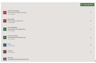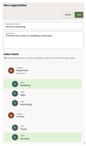 In the examples below, consider the following labels: Germany, France, Marketing, Advertising, BrandA, and BrandB. Using these labels, we establish the organizations Germany, Germany Marketing, France, France BrandA, France BrandB, and BrandB, and then assign them to users Alice, Bob, Carl, and Diane.