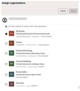 All Access Members: Users in the All Access organization see counts and samples for all records, regardless of labels (even under strict enforcement). They can still filter counts and samples for up to 10 organizations via the popup.