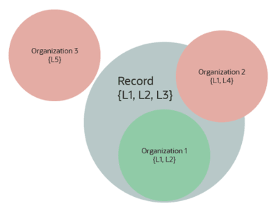 The organizations linked with a particular user or resource determine the records they can access. A record becomes available to a user if it includes all the labels from at least one of the user’s organizations. In other words, the organization's labels must be a subset of the record’s labels.