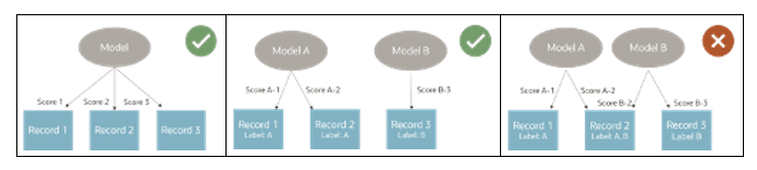 Mutually Exclusive Labels: If business requirements prevent using a single model for all records, ensure the labels applied to data objects are mutually exclusive.