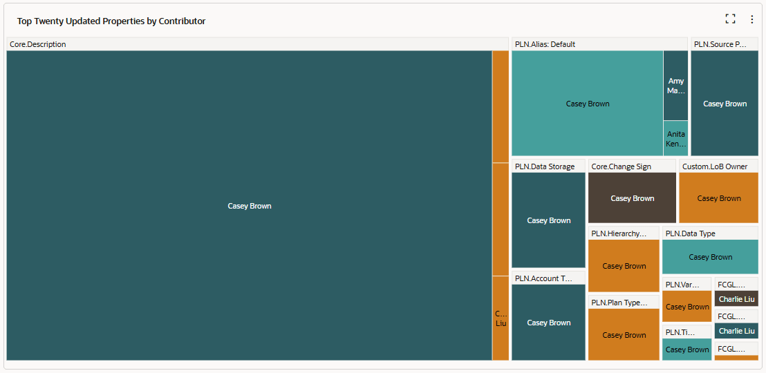The Top Twenty Updated Properties by Contributor dashboard panel displays the top twenty properties that have been updated per contributor in a treemap chart. Each segment of the chart represents the changes to a specific property by a specific user, with bigger segments representing greater numbers of changes.