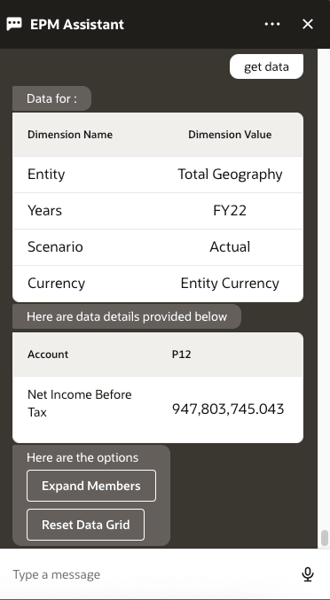 The Get Data intent allows you to request data for multiple members in a single utterance. You can also view information in a table format and expand the members to view the details with ease. Additionally, with the Pivot intent you can add or remove dimensions and change the structure of the table.