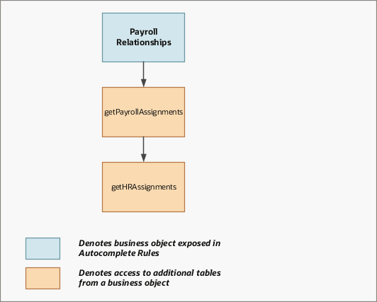 To navigate to the Payroll Assignment business object traversing row variable on Get Payroll Assignment. For example, to navigate to HR assignment, first you get a handle to Payroll Assignments. |