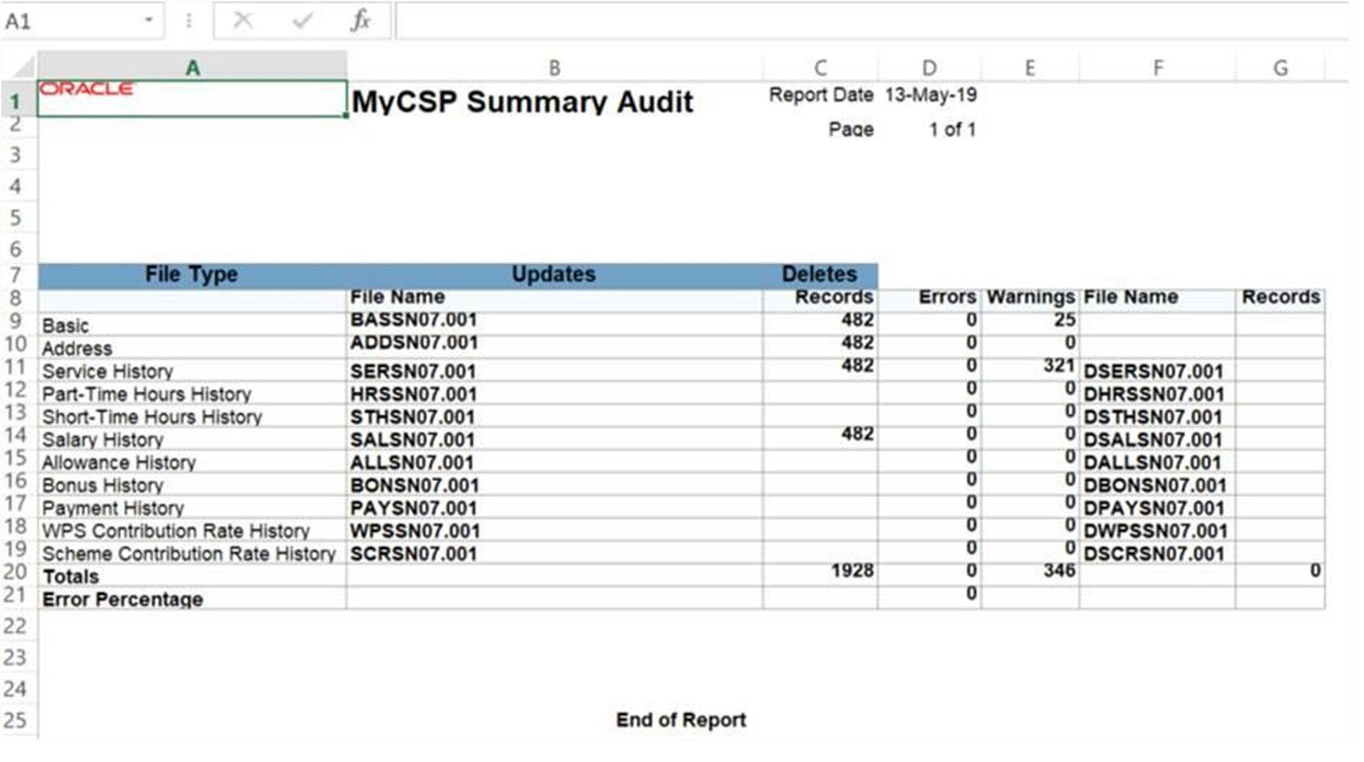 The initial summary audit report gives a file-level overview of the number of records processed and the number of errors and warnings in each interface (shown for both changes and deletions). The error percentage for the total number of records is also displayed.