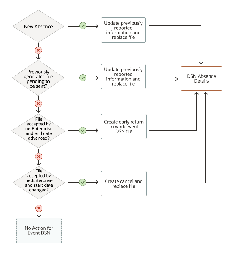 The ESS process will read the absence changes comparing to the previous submission and will prepare the reporting information for next submission. This process reads the changes in the absences and store the information to be reported after analyzing the previous submission status, acceptance status of previous status. The flow ‘Absence Event DSN’ will then trigger DSN validations as per 2025 DSN Specs and generate the files.