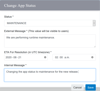 If you are setting the status to Maintenance, you'll be asked to provide your app users a message with an estimated date and time for resolution. You can also enter an internal message visible only to other members of your App Provider. If an app is in Maintenance, all app's installations will also have their status set to Maintenance. The app's status must be Up before app installations can be set to Up.