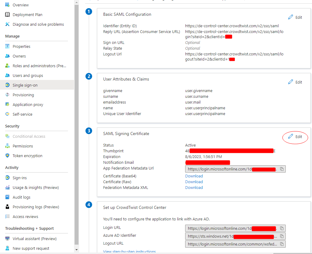 - https://[environment]control-center.crowdtwist.com/v2/sso/saml/metadata?siteId=2&clientId=[client_id]
