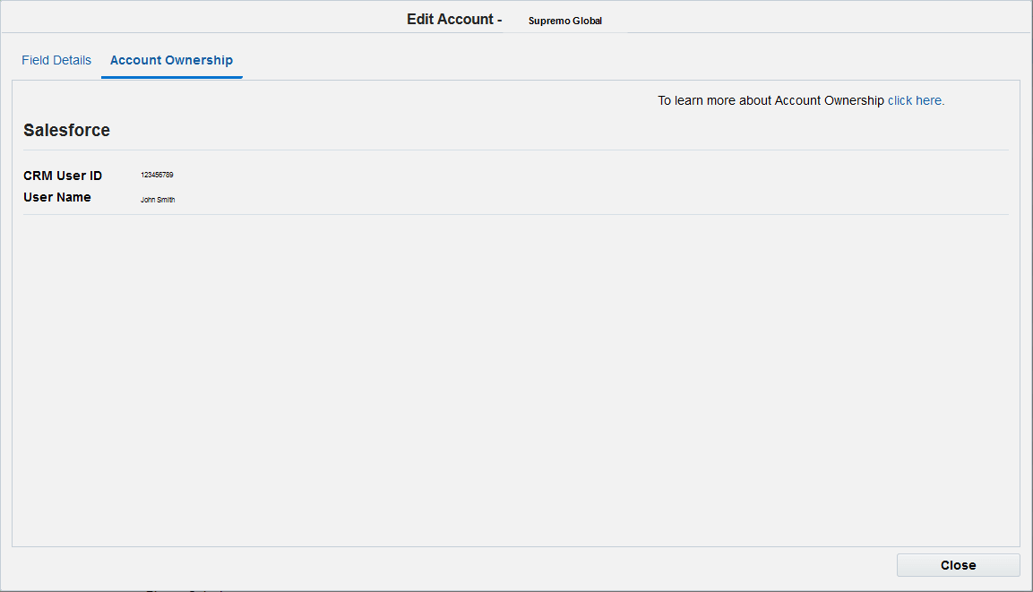 - Only a single account owner can be imported. In Oracle Sales, the owner is identified using the OwnerPartyId. In Salesforce, the owner is identified using the OwnerId.