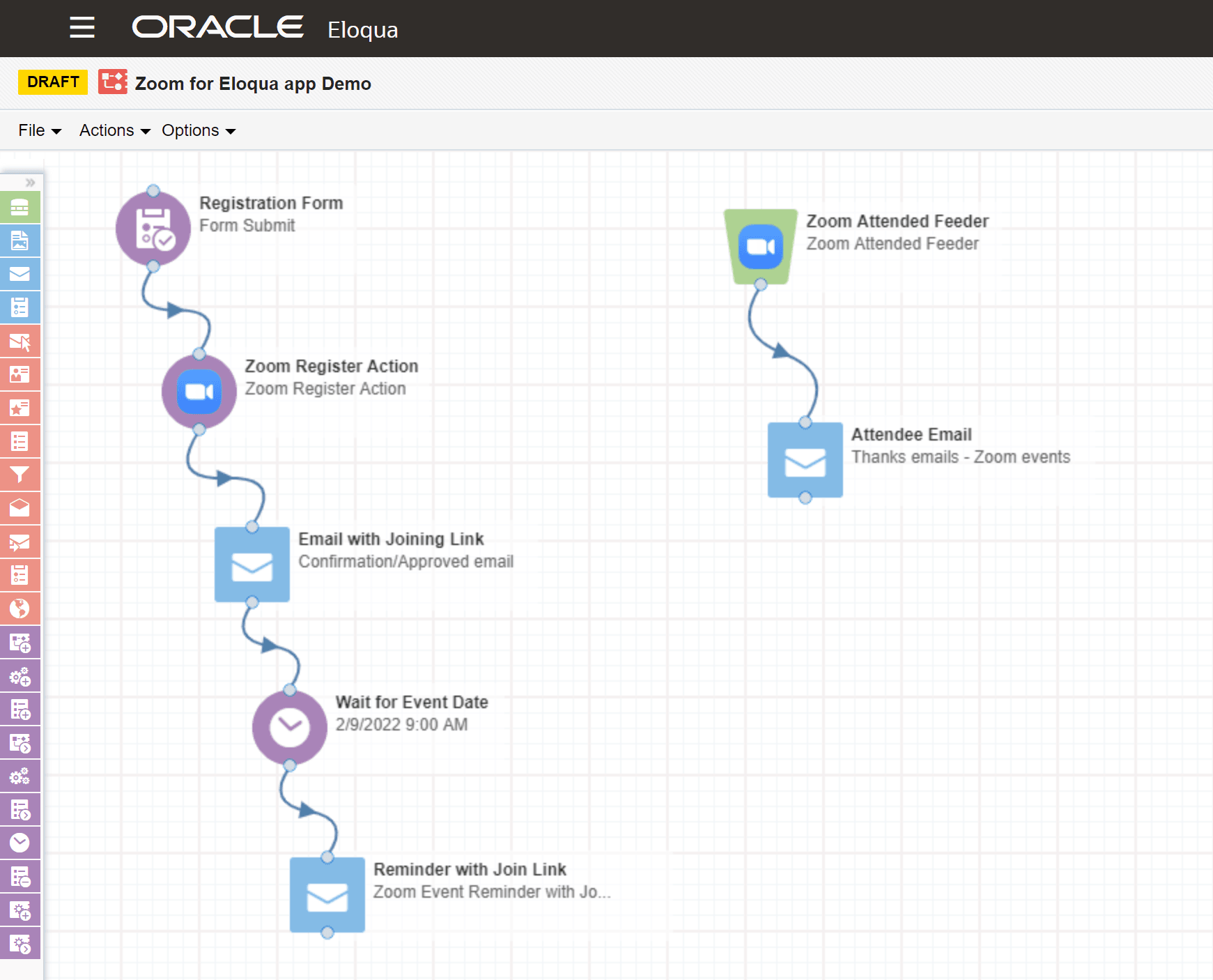 This is an example of a campaign using the Zoom for Eloqua app components, showing how registrants flow from Eloqua and are associated with the meeting or webinar in Zoom. Then once the event is over, the attendee information is pulled back into Eloqua for follow-up and subsequent campaigns.