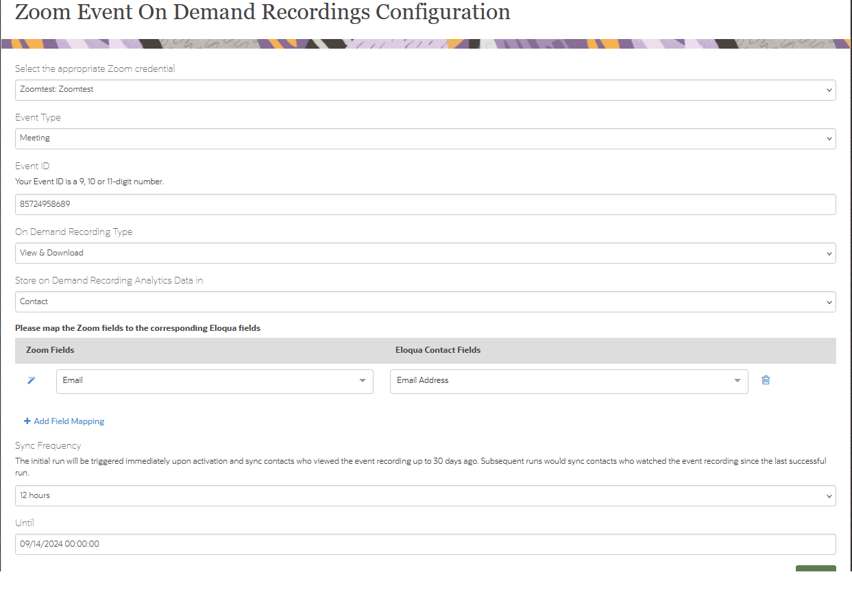 - Sync frequency: : The initial run will be triggered immediately upon activation and sync contacts who viewed the event recording up to 30 days ago. Subsequent runs would sync contacts who watched the event recording since the last successful run.