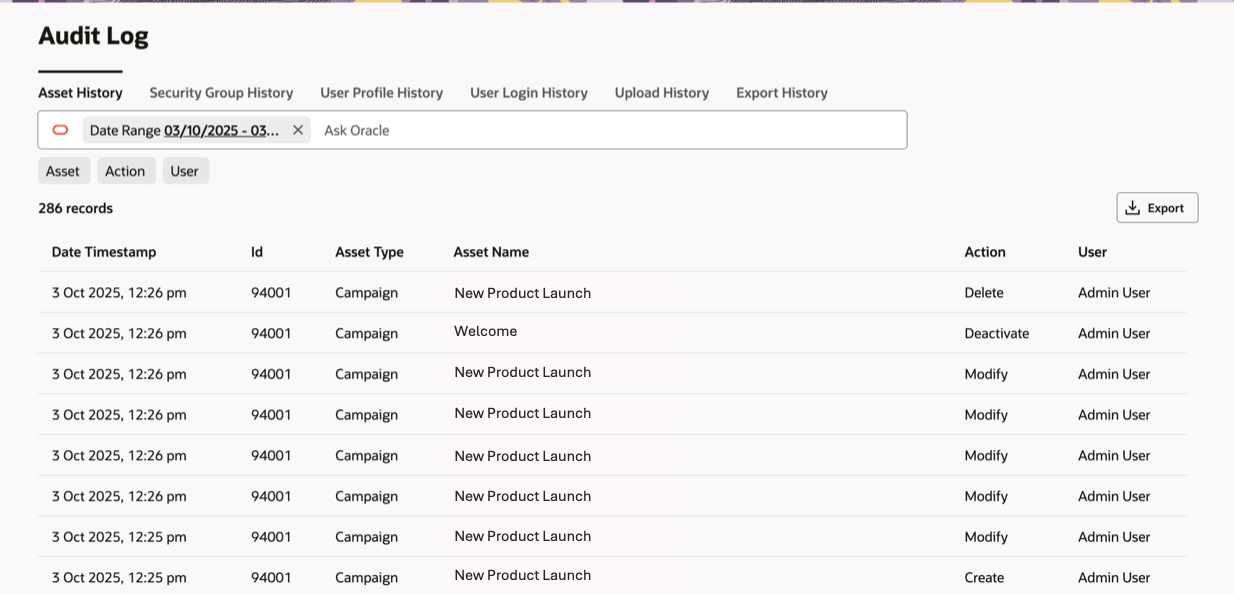 You can use the Oracle Eloqua audit history to view up to 3 months of audit log data at a time. If you need to view audit logs for longer periods, export the audit log instead. A maximum of 5 million audit log records can be exported at one time.