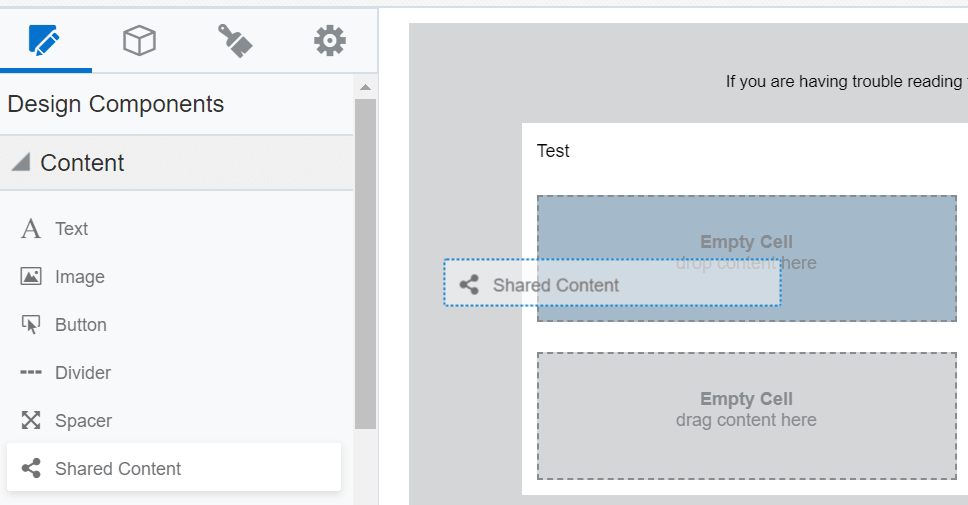 Shared content is reusable content snippets that you can create once, then reuse in different emails and landing pages. It allows you to "build once, re-use everywhere" for your most valuable common pieces of content. Shared content is stored in the component library.