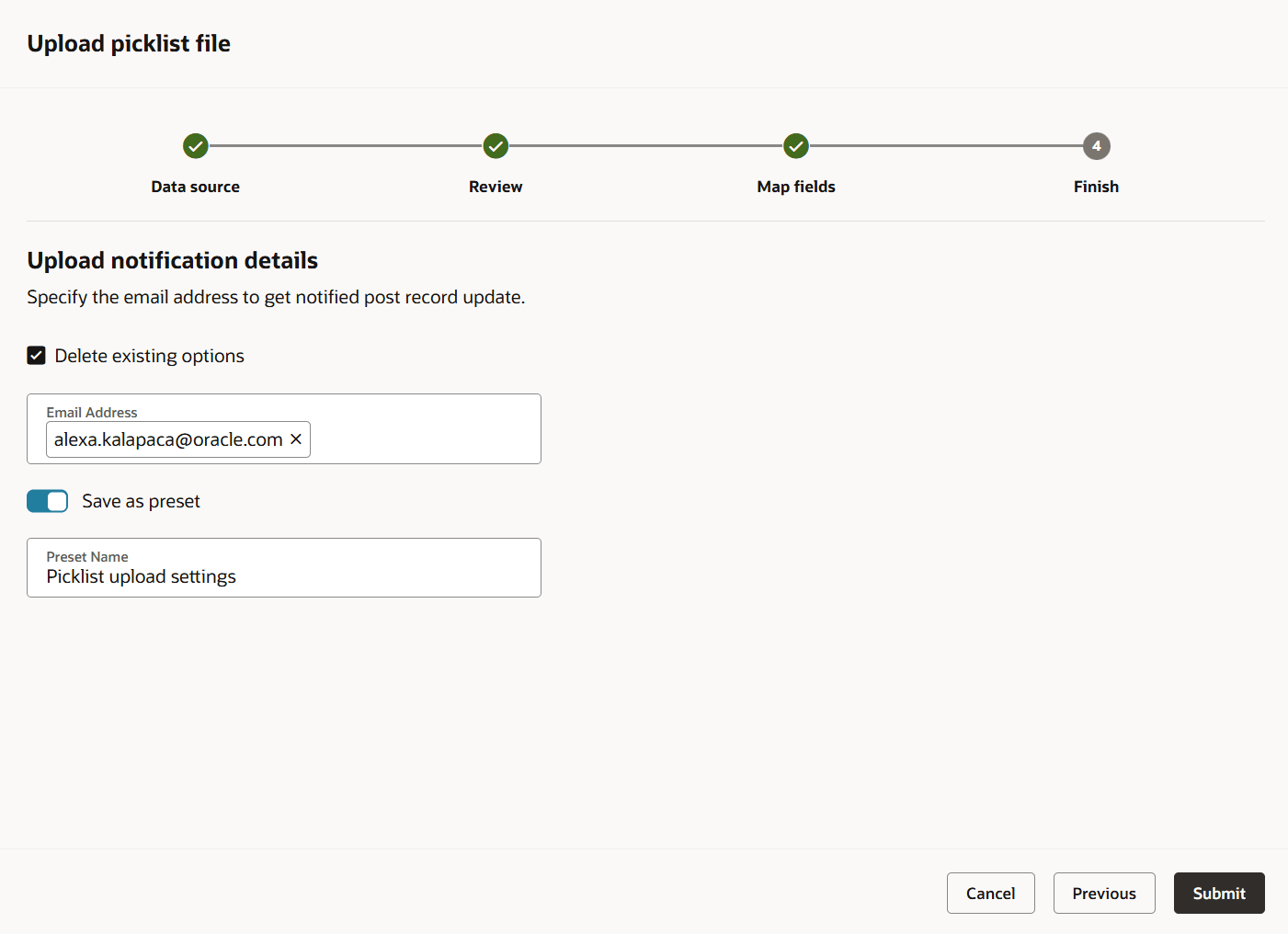 Specify who should get a notification of the upload. In the classic UI, this is on the Summary step. In the Redwood experience, this is on the Finish step.